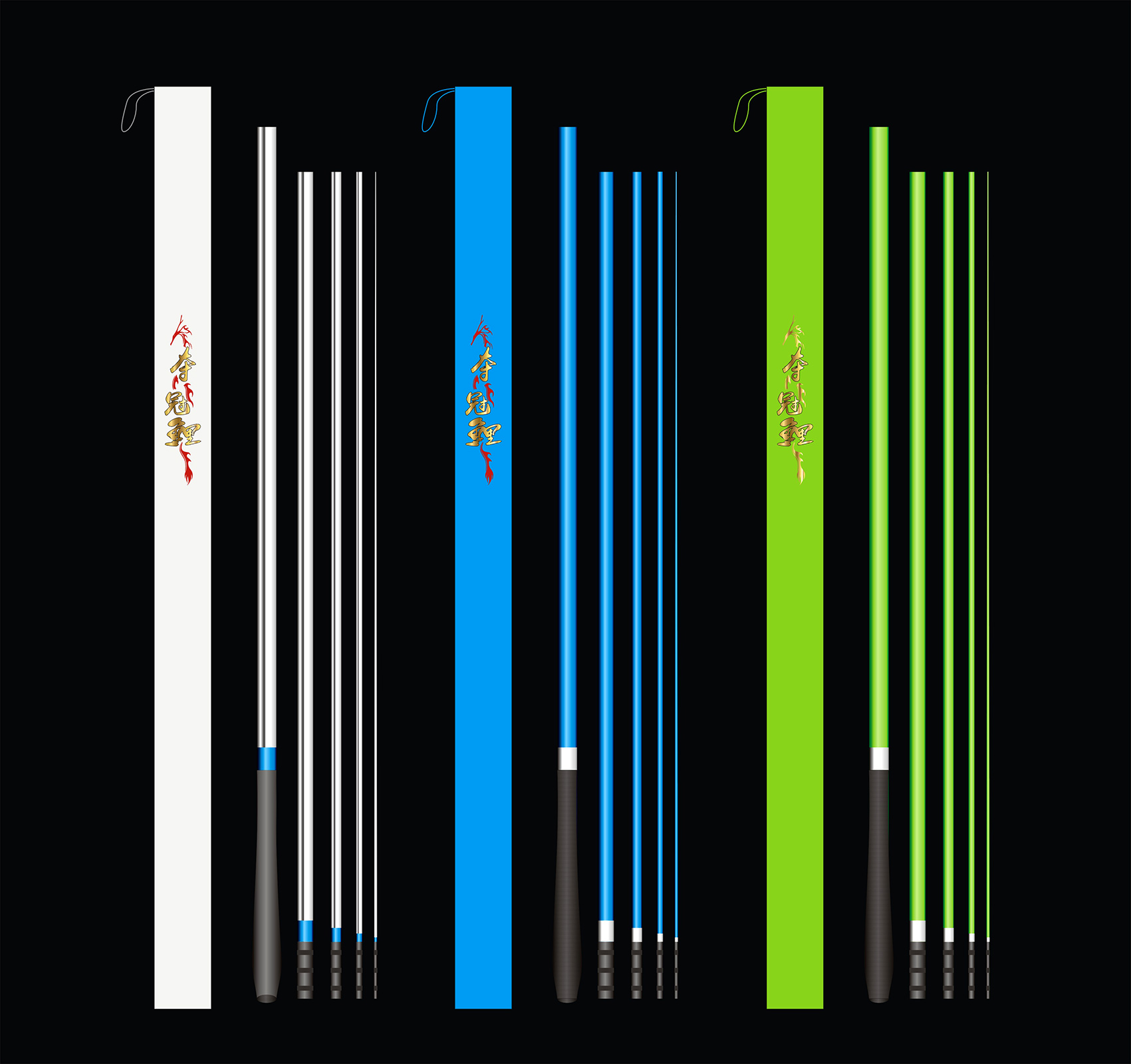 我想象中,這三款魚竿,采用電鍍漆的工藝,拿在手上噌亮的感覺,應該很好,包括竿架和抄網(wǎng),做成一個系列,